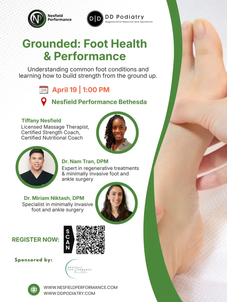 Your feet are the foundation of every movement you make. Join us for an educational session focused on understanding common foot conditions—such as bunions and plantar fasciitis—and learning how to build strength, stability, and resilience from the ground up. This is the focus of Grounded: Foot Health & Performance.